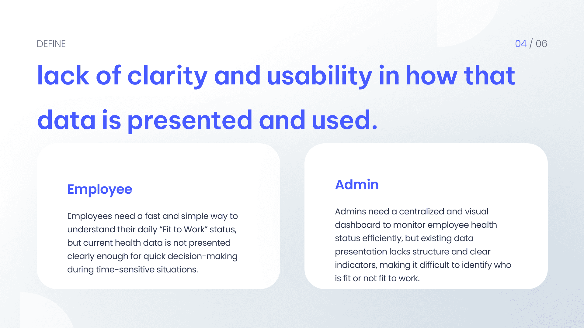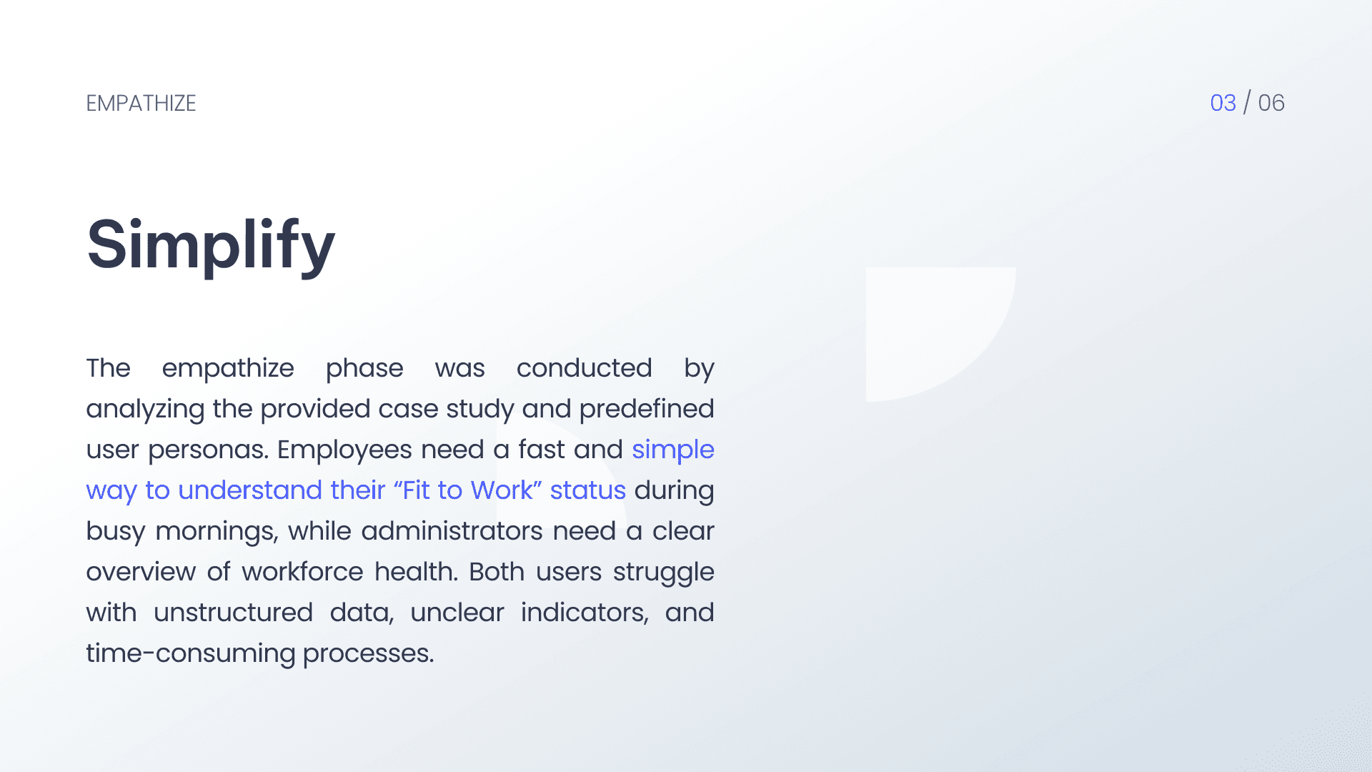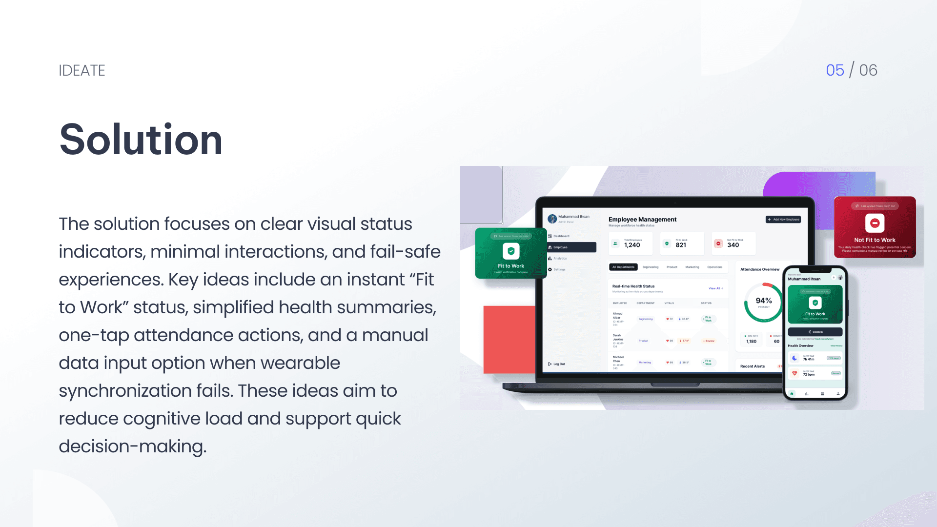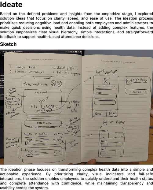 The solution focuses on clear visual status indicators, minimal interactions, and fail-safe experiences. Key ideas include an instant “Fit to Work” status, simplified health summaries, one-tap attendance actions, and a manual data input option when wearable synchronization fails. These ideas aim to reduce cognitive load and support quick decision-making.