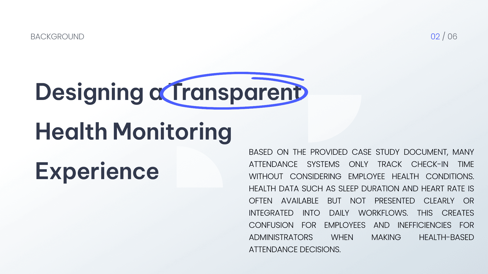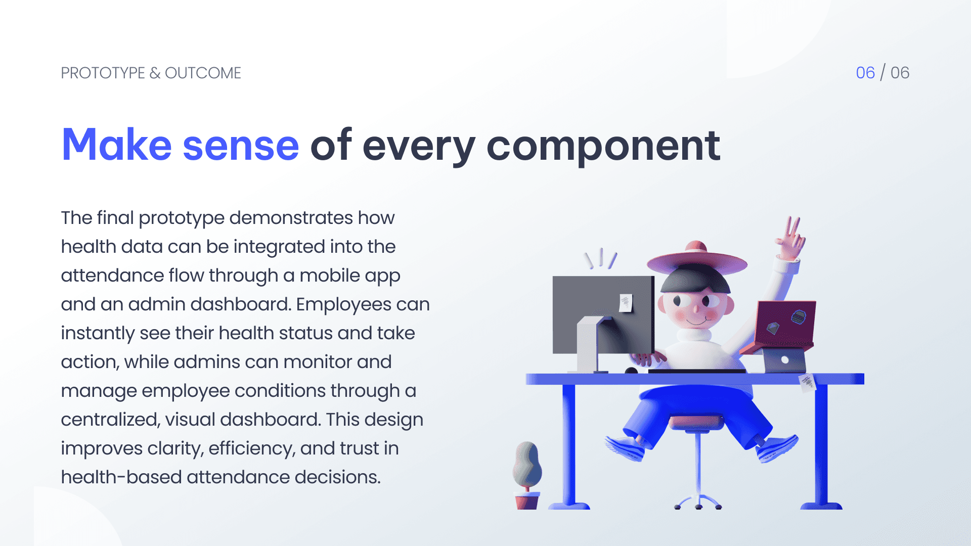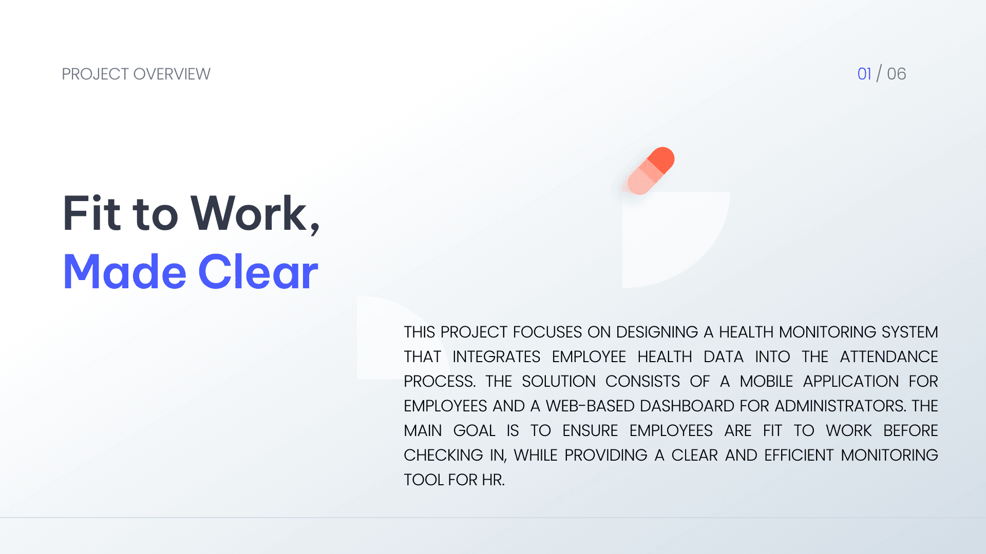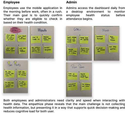 This project focuses on designing a health monitoring system that integrates employee health data into the attendance process. The solution consists of a mobile application for employees and a web-based dashboard for administrators. The main goal is to ensure employees are fit to work before checking in, while providing a clear and efficient monitoring tool for HR.